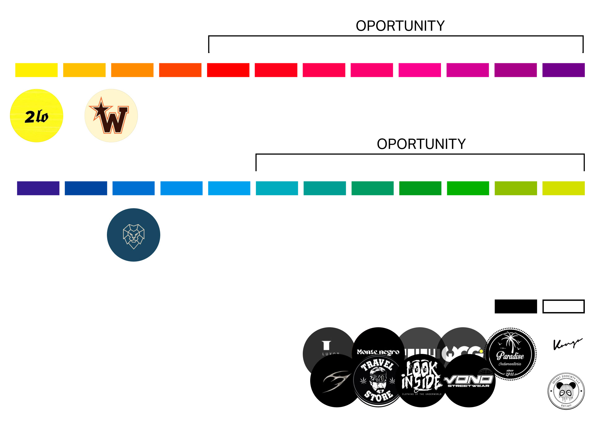 Due to the idea of Triple Five being a store that seeks to get out of the "mainstream" clothing, we have made a research of the competition in order to find our aesthetic niche to be able to choose style and color of the brand.